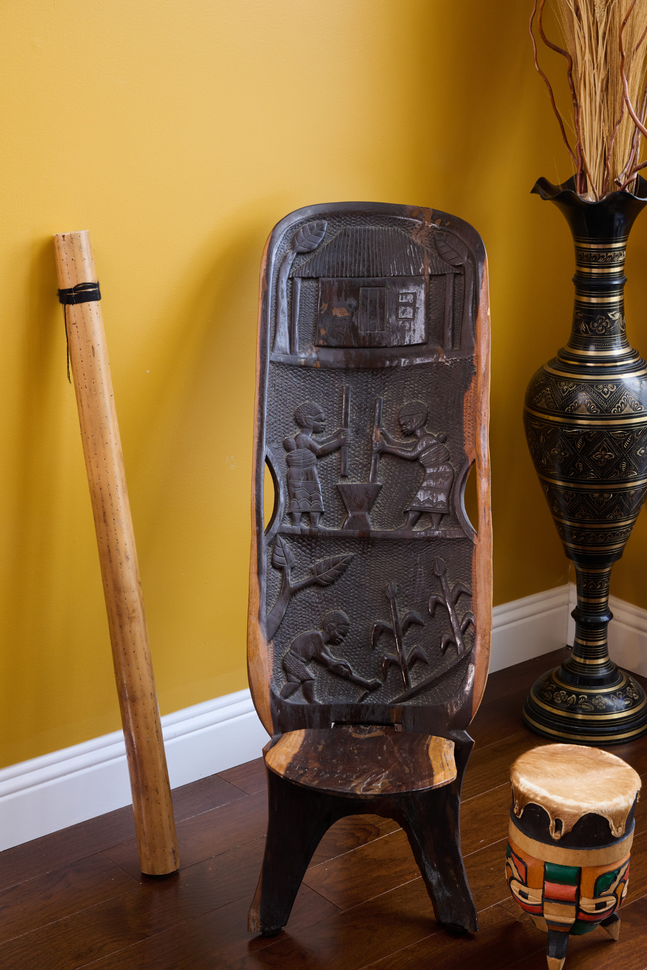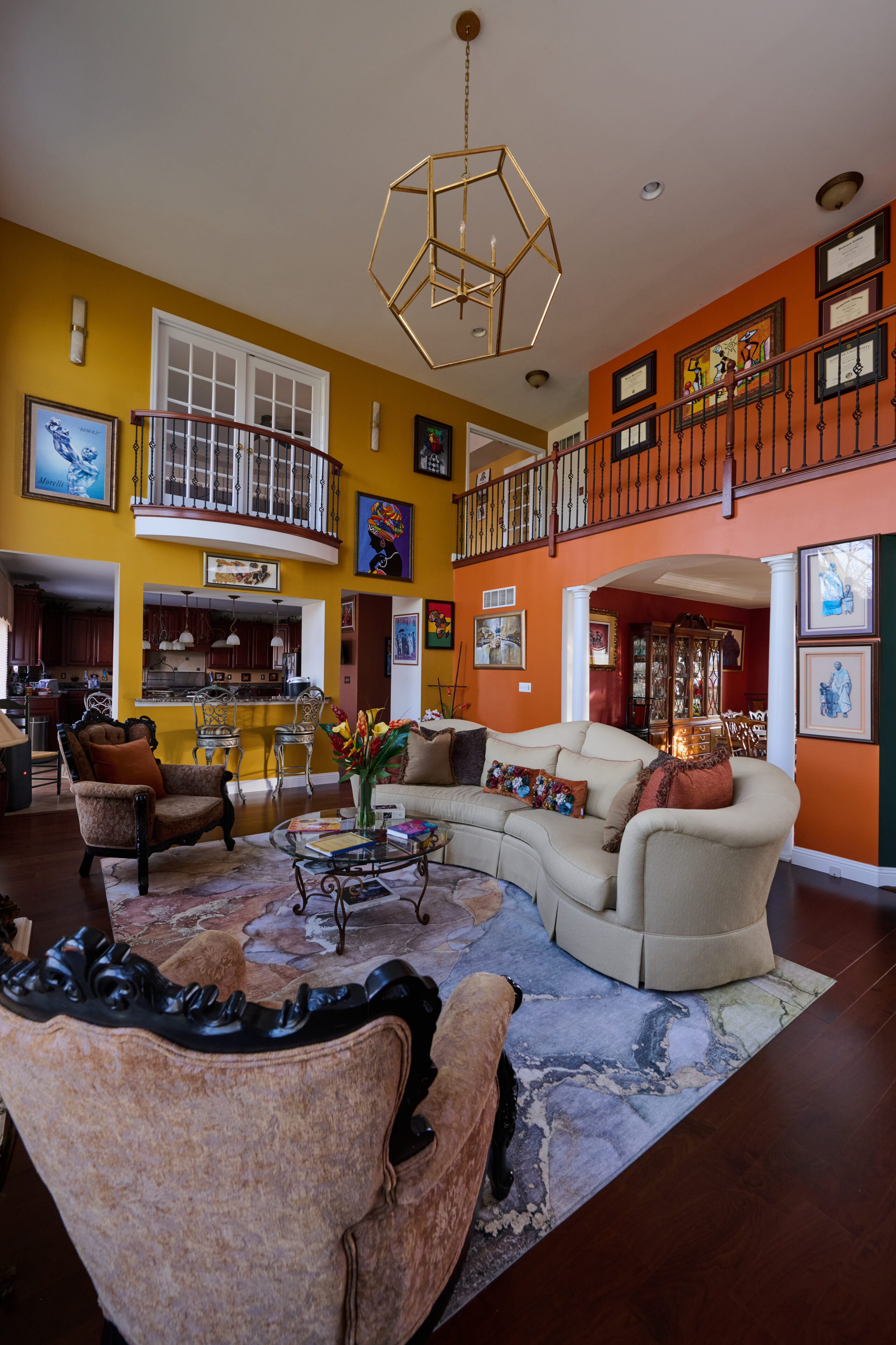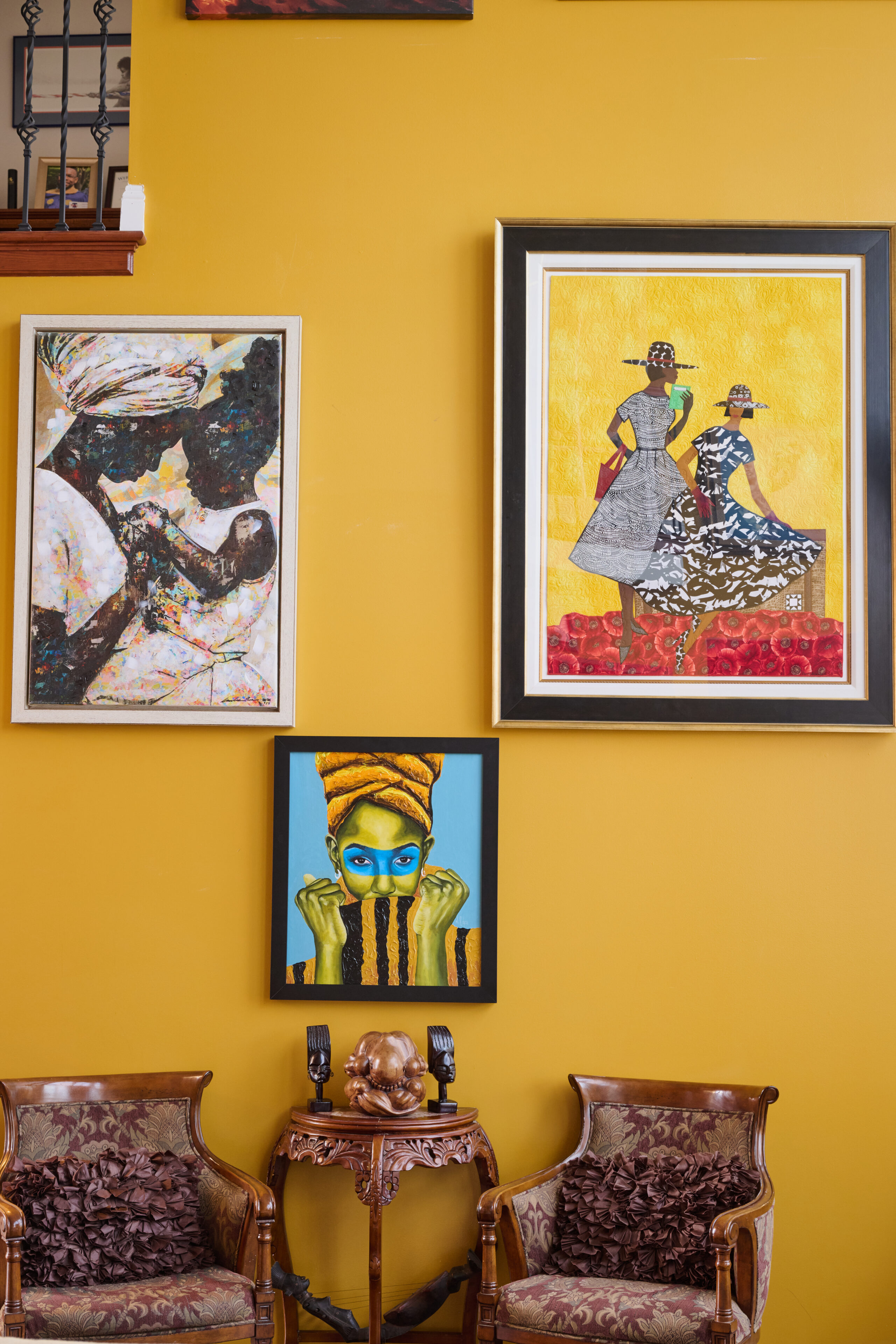 Living room wellness interior by SanctuaryIAM, layered with vibrant color, cultural artwork, and collected artifacts that reflect personal history and intentional living.